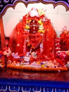 The idol of Nagas shows a well built man standing upon two wild animals with winding his chest and showing masculinity and warrior-ism. Yellowish skin dress with loin cloth and tiger skin around his chest. That part is adorned with different weapons like shield, sword, dagger and knife. Holding mashal or flowers and a gun in both hands. His face consist big round fierce eyes, sharp nose, curly mustache and beard. On his head a headgear (handia – ହାଣ୍ଡିଆ) is adorned and a lotus flower is in the top of the headgear. His back is adorned with a bamboo mat (ତାଟି) as same as a bow.